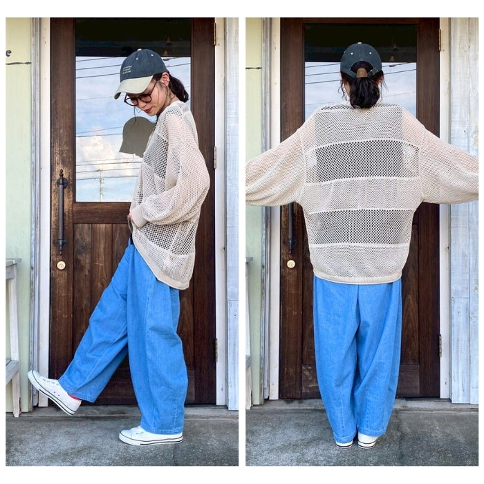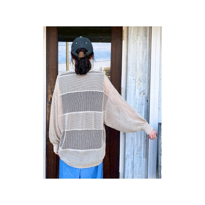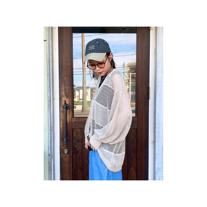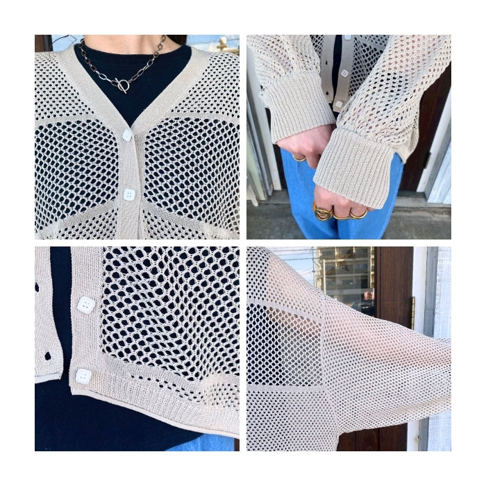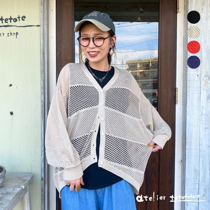 261042 レーヨン混麻タッチニット透かし柄Vカーデ