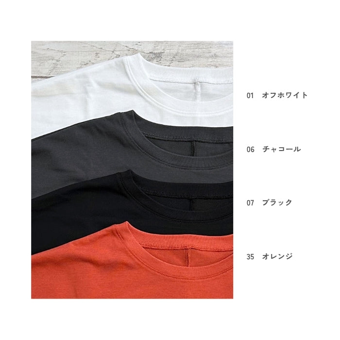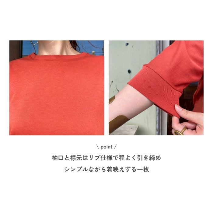 袖口と襟元はリブ仕様で程よく引き締め、シンプルながら着映えする一枚。