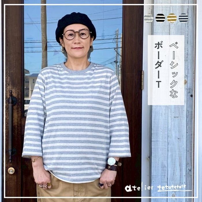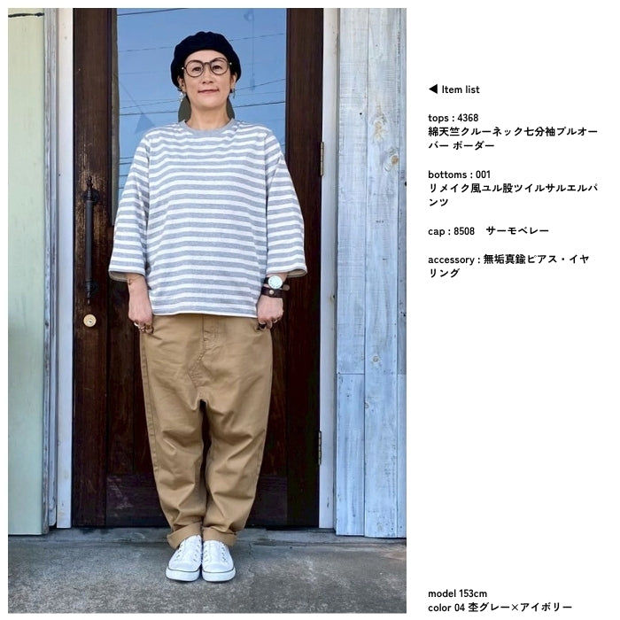 4368 綿天竺クルーネック七分袖プルオーバー ボーダー
